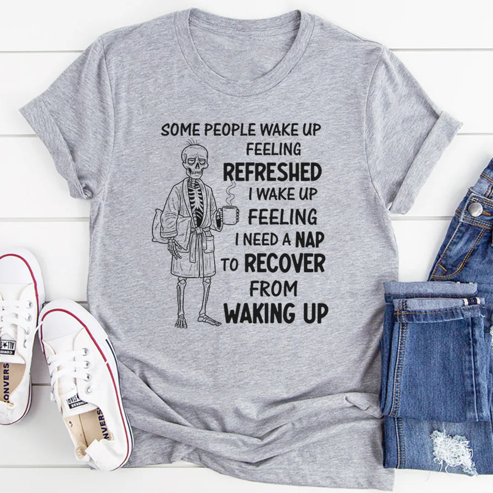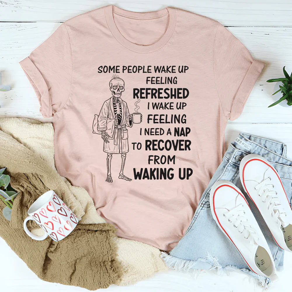 Mornings are a suggestion, not a command. If your first thought upon waking is plotting your return to bed, this tee is your spirit animal. The "Some People Wake Up Feeling Refreshed, I Wake Up Feeling I Need a Nap to Recover from Waking Up" shirt is the official uniform for night owls, professional snoozers, and everyone who treats caffeine as a life necessity.